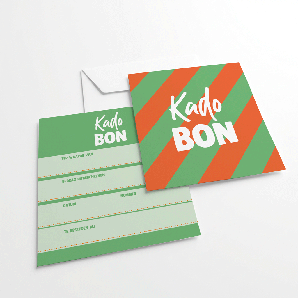 Uit onze eigen ontwerpstudio! Deze leuke multi colour Stripe cadeaubon is voorzien van de tekst Kadobon. Aan de achterzijde is ruimte voor je bedrijfstempel, de bedragen, datum en het nummer van de cadeaubon.