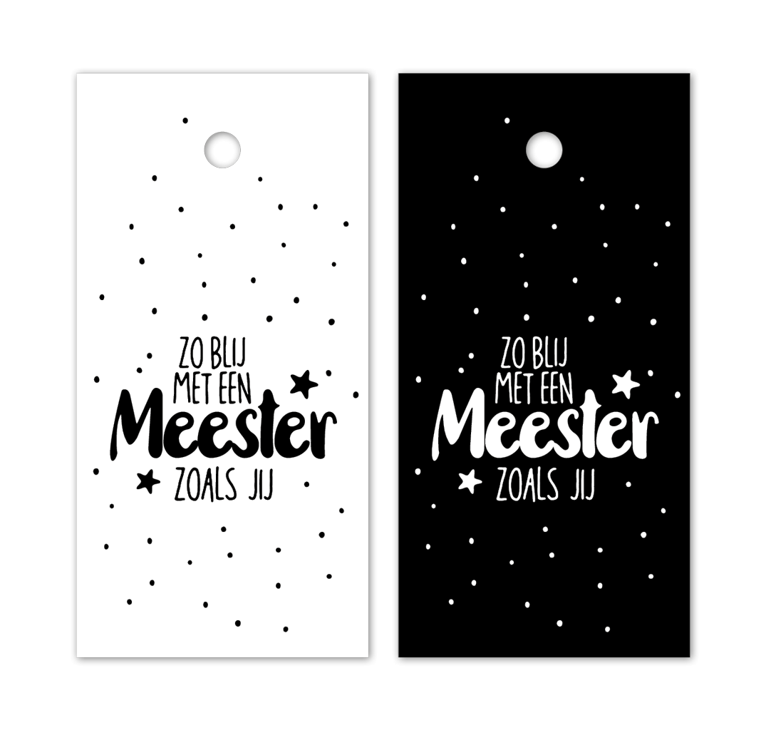 Dit label is speciaal voor de Meester. Met de tekst "Zo blij met een Meester zoals jij." Van beide kanten te gebruiken.Maak het vast met een leuk lintje of koordje.
