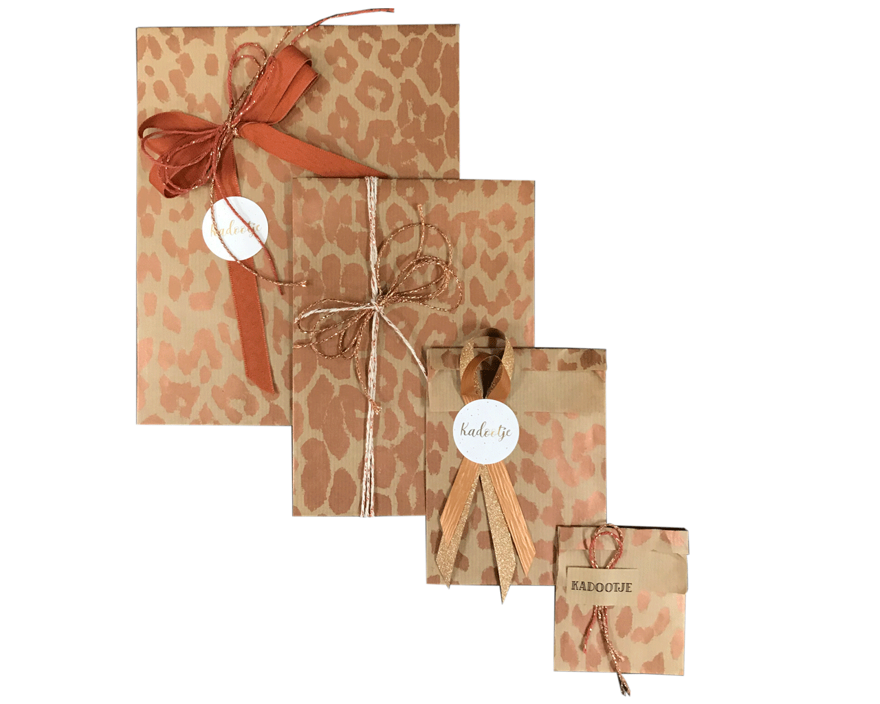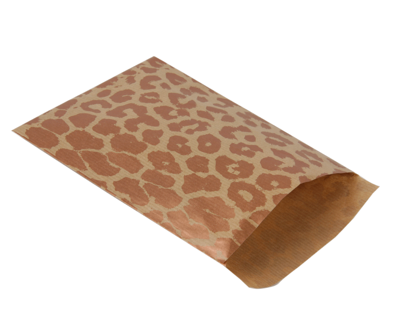 Een kraftkleurig cadeauzakje met een eigentijdse luipaardprint. Geschikt voor bijvoorbeeld fournituren en sieraden.