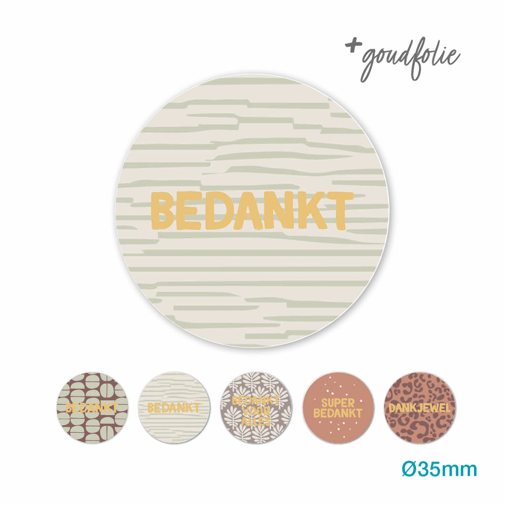 Verschillende etiketten op een rol met een extra goudfolie accent. Mooie warme kleuren die je met elkaar kunt combineren. 5 verschillende stickers van 35mm rond op een rol. Combineer deze sticker met een leuk lintje en hangkaartje en je hebt een super kado.