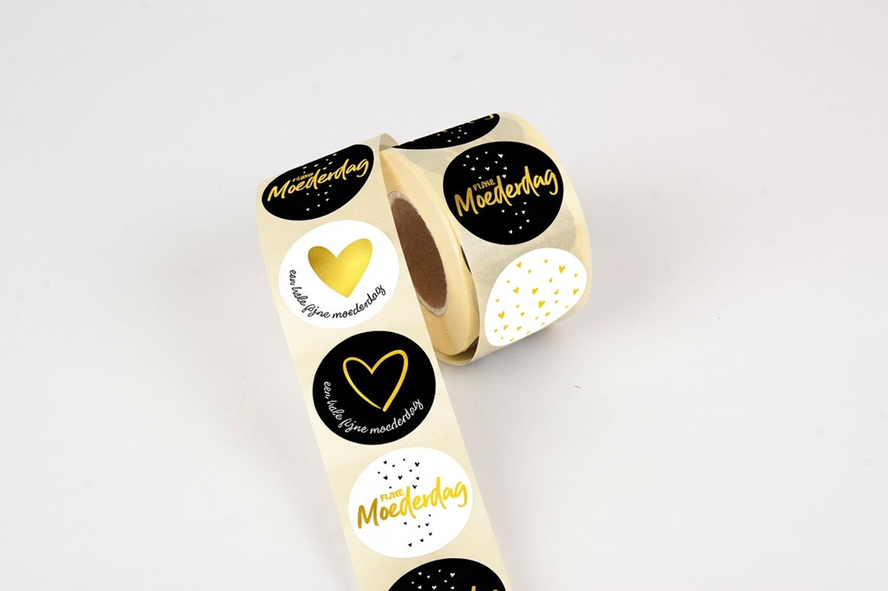 Zo leuk deze etiketten op rol speciaal voor moederdag in de kleuren zwart wit bedrukt met goudfolie. 5 verschillende stickers van 35mm rond op een rol. Combineer deze sticker met een leuk lintje en hangkaartje en je hebt een super kado.