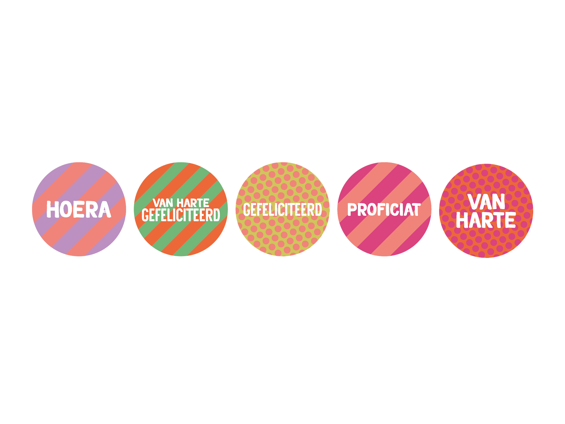 Verschillende etiketten op een rol in de hippe trendkleuren. Mooie kleuren die je met elkaar kunt combineren. 5 verschillende stickers van 35mm rond op een rol. Combineer deze sticker met een leuk lintje en hangkaartje en je hebt een super kado.