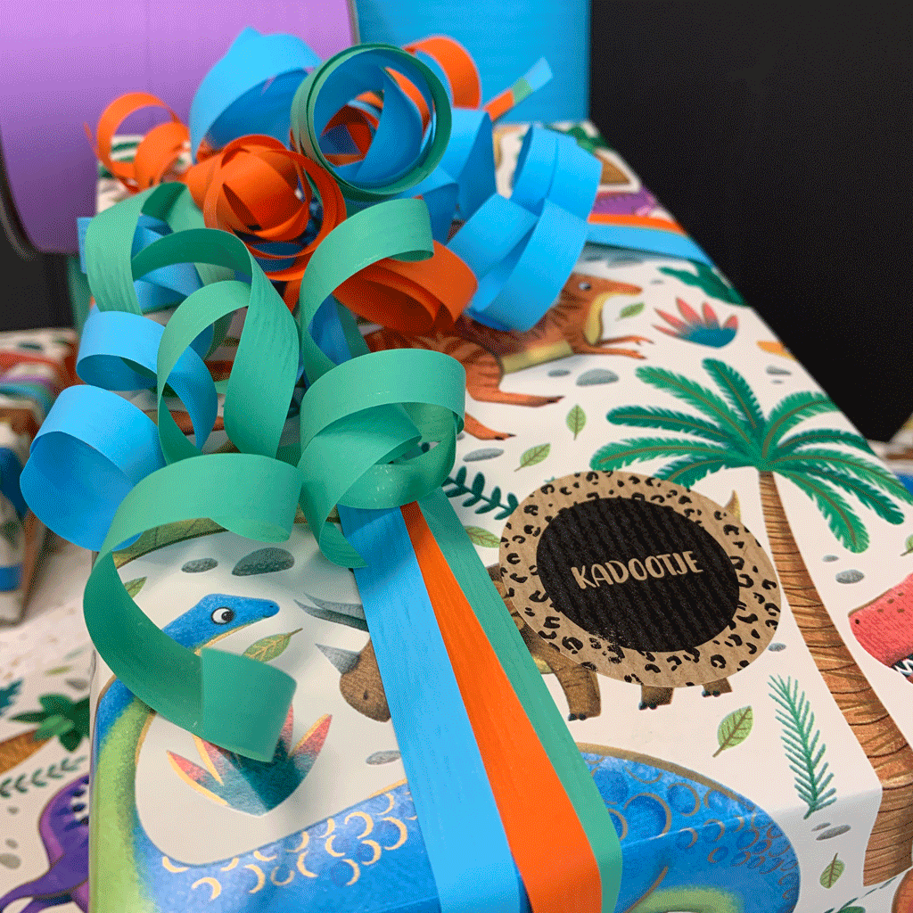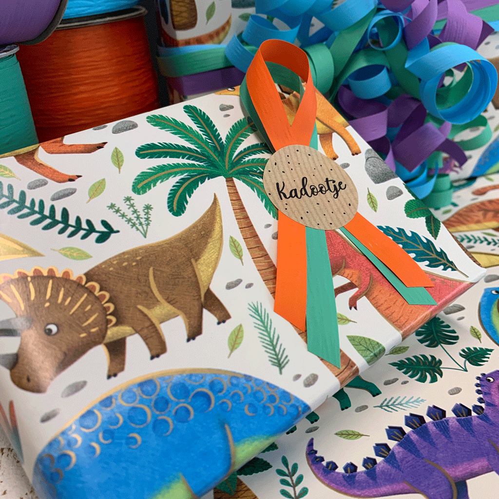 Dit super leuke papier heeft een opdruk van allemaal dino's in verschillende kleuren. Super leuk te combineren met een mooi lint of sticker. Dit papier heeft het FSC keurmerk.