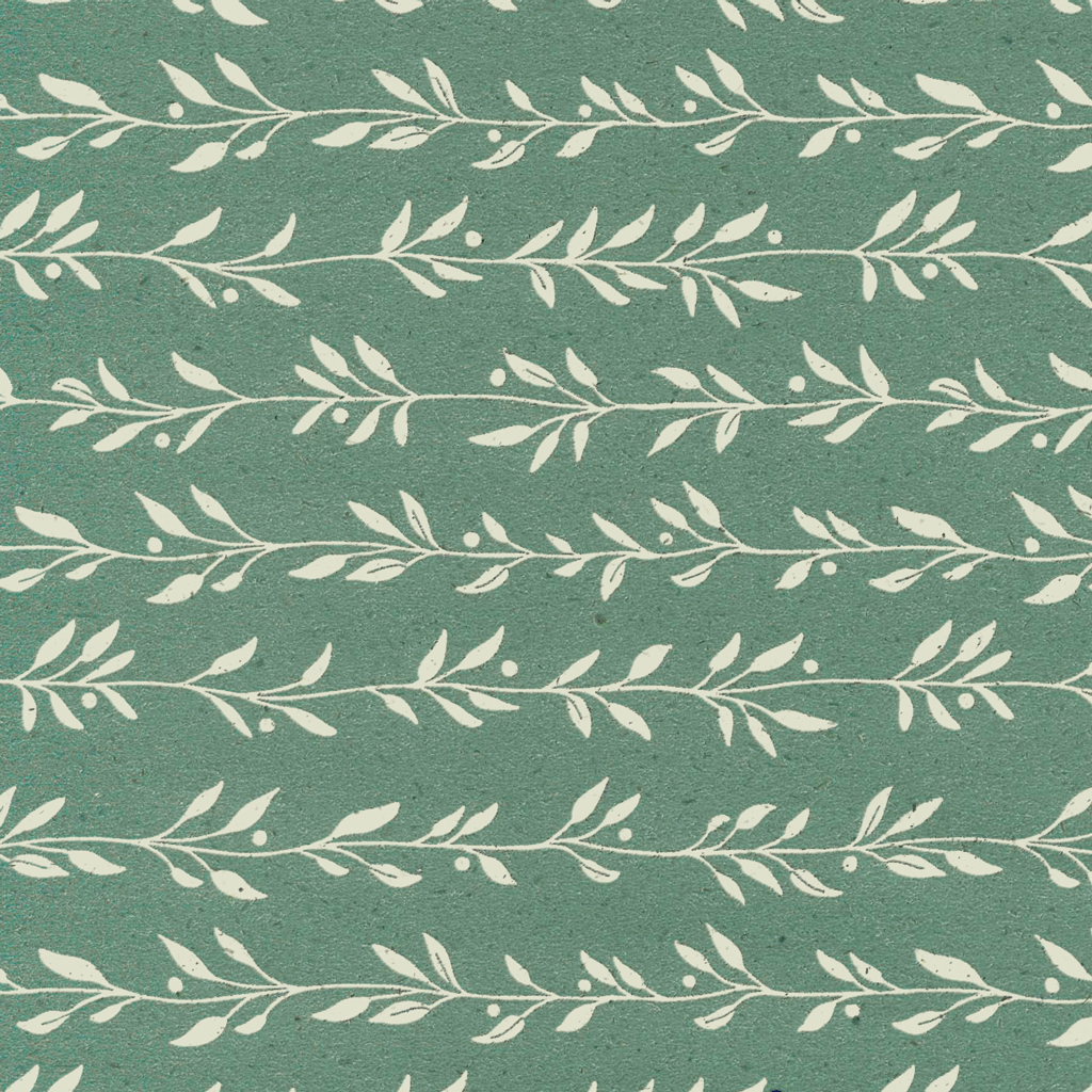 Dit inpakpapier heeft een herhalend patroon van fijne bladlijnen op een warme groene ondergrond. Het dessin is rustig en gelijkmatig en leent zich goed voor verschillende soorten verpakkingen.