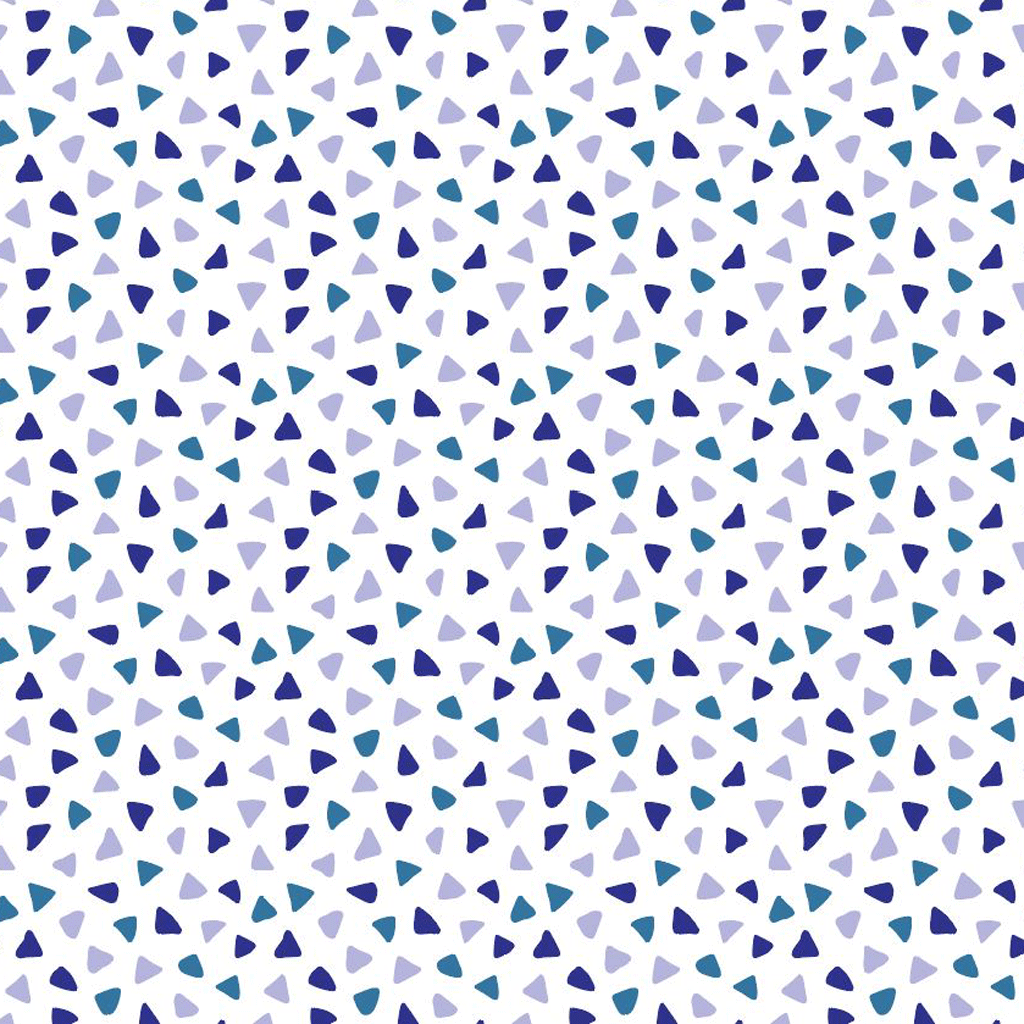 80 grams coated inpakpapier met een witte ondergrond en voorzien van kleine driehoekjes in drie kleuren blauw.