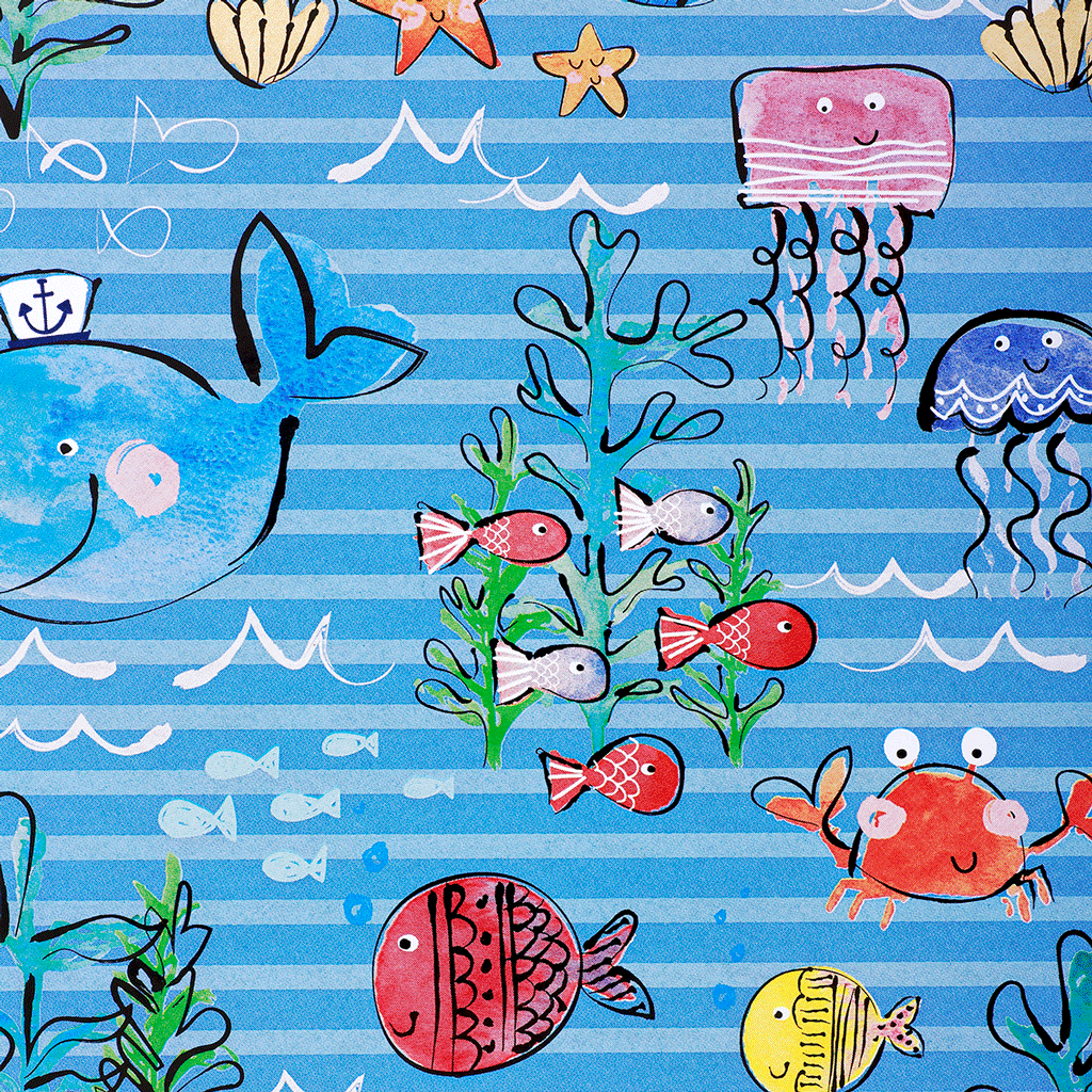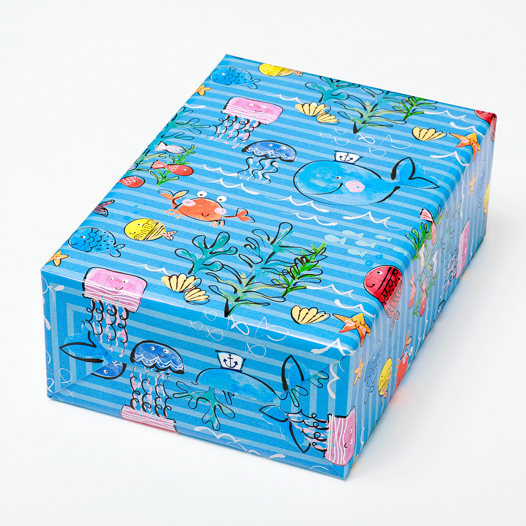 Superleuk inpakpapier voor kinderen met een maritiem of zee thema. Duik diep onder water en zie al deze leuke visjes, kwallen, zeesterren en schelpen drijven en zwemmen. Hartstikke leuk voor een strandtent, souvenirshop aan de kust of op een eiland zoals Texel of Terschelling.