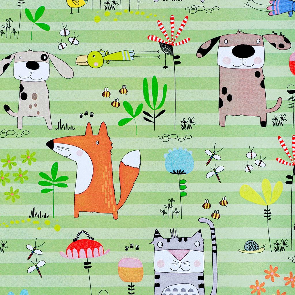 Superleuk inpakpapier voor kinderen met een kleurrijken print van allemaal dieren op een gestreepte groene achtergrond. Goed te combineren met mooi krullint, een leuke sticker en klaar is je cadeau!