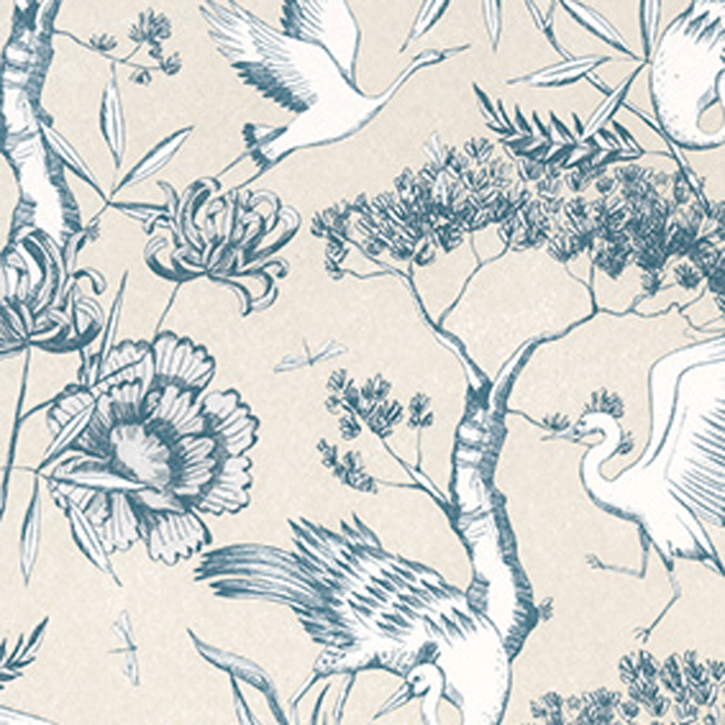 Cadeaupapier Inzai is stevig, maar toch soepel inpakpapier met een mooie print van een kraanvogel en bloemen met een taupe kleurige ondergrond en een warm donkerblauwe bedrukking.