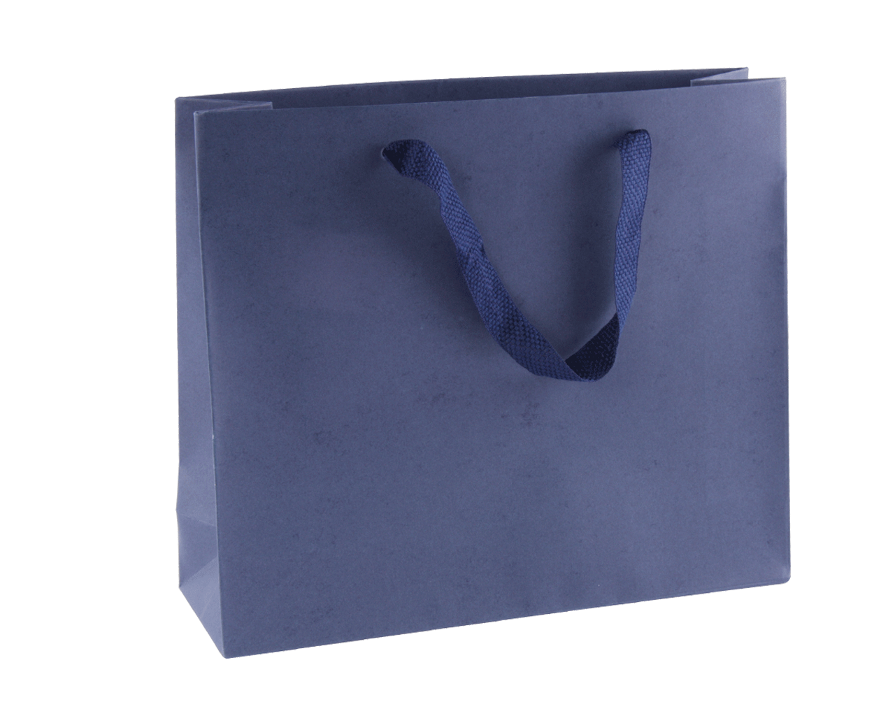 Deze donkerblauwe papieren draagtas heeft een mooi geweven lint als handvat, waardoor de tas een luxe uitstraling heeft. De tas is tevens niet gelamineerd, waardoor deze weggegeven mag worden.