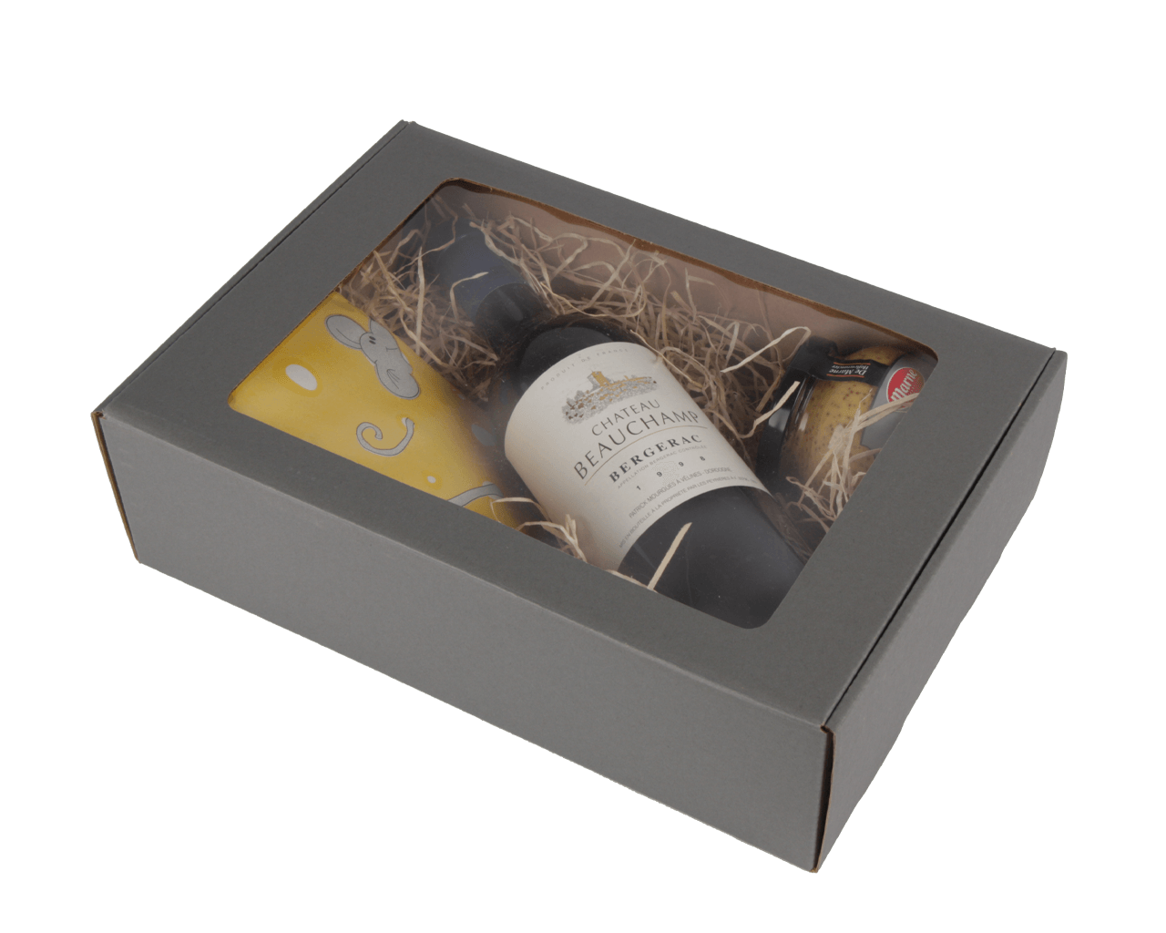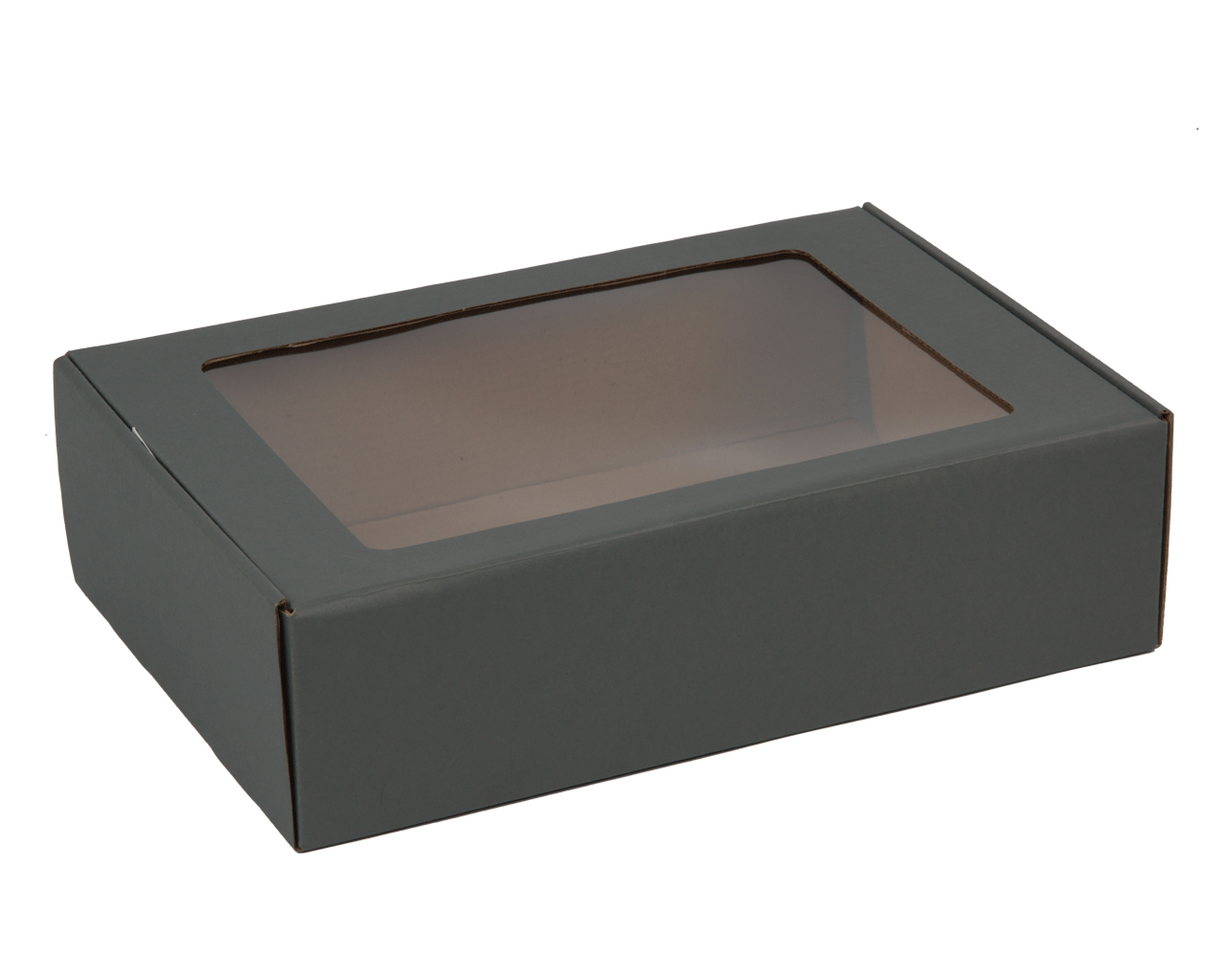 Superleuke vensterdoos van stevig bruin kraft met een donkergrijze all over bedrukking en een glashelder zichtvenster.