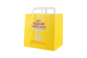 In deze tassen geef je gemakkelijk de gevulde zakken met oliebollen mee aan de klant. Handig, mooi en in hetzelfde dessin als de oliebolzakken!