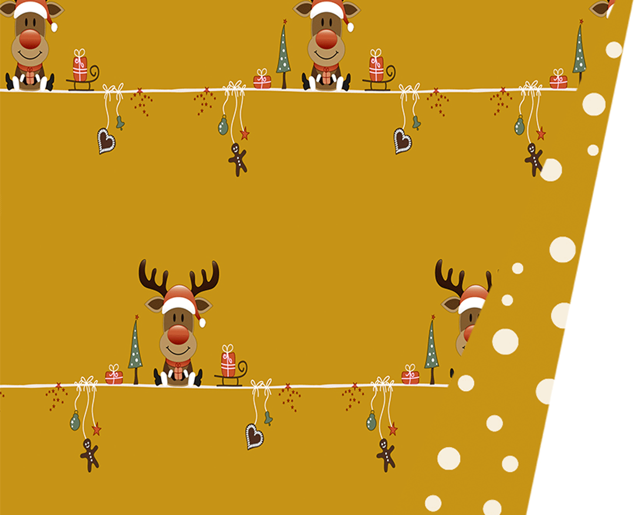 Hip en grappig Kerstpapier op okergeel dubbelzijdig papier voorzien van Rudolph the Rednosed Reindeer.