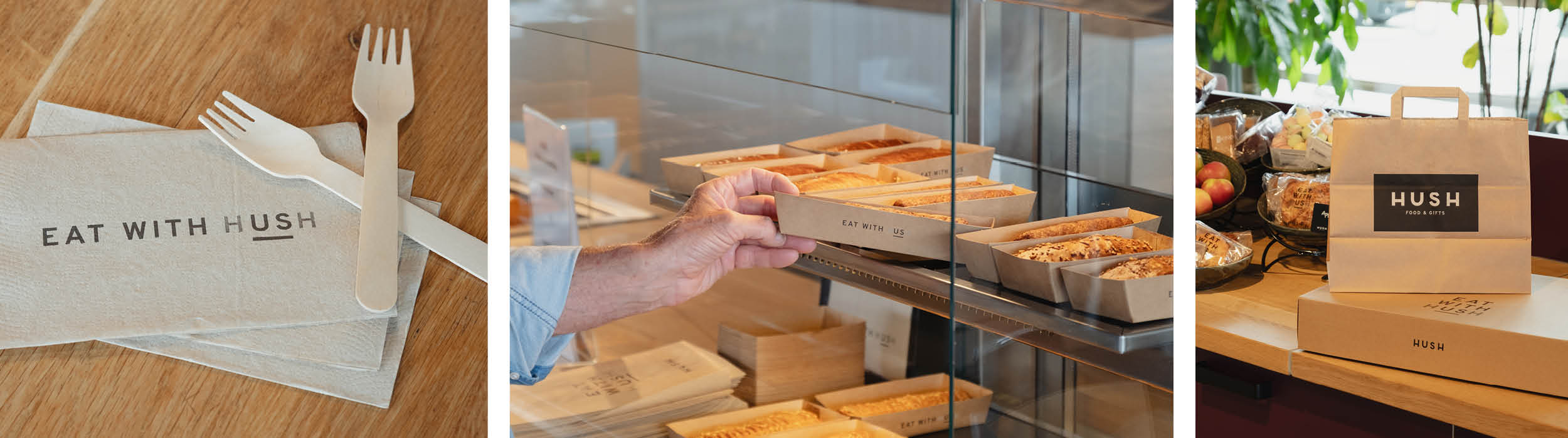 De slogan Eat with HUSH komt op subtiele wijze terug op elk item. Denk aan kraftzakjes, rPET-smoothiebekers met handige inlay, bedrukte draagtassen en servetten met logo. Zelfs de saladebowls zijn voorzien van naamstickers die bijdragen aan herkenning en presentatie.