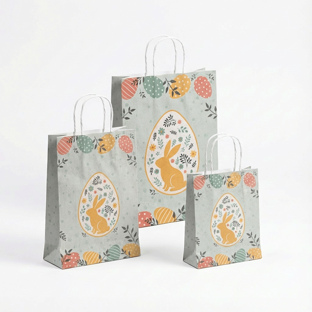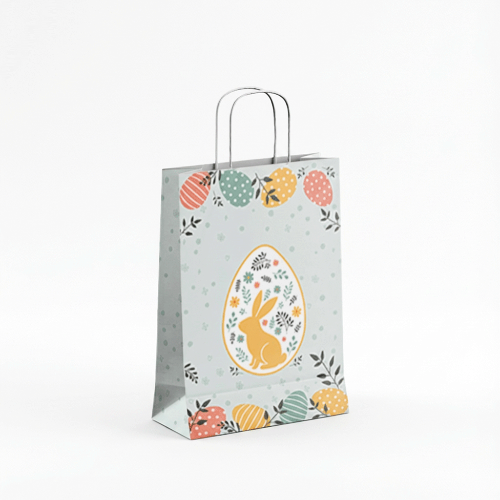 Deze papieren draagtasjes Easter Glow zijn voorzien van een gedraaid papieren koord en zijn gemaakt van wit ongestreept kraft papier. Speciaal bedrukt met een leuk dessin voor Pasen. Papieren draagtassen zijn sterk en hebben een luxe uitstraling. Deze tas is gemaakt van 90 grams papier.