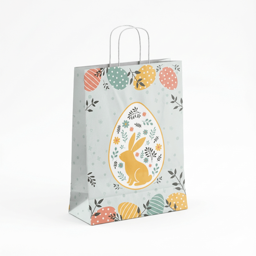 Deze papieren draagtasjes Easter Glow zijn voorzien van een gedraaid papieren koord en zijn gemaakt van wit ongestreept kraft papier. Speciaal bedrukt met een leuk dessin voor Pasen. Papieren draagtassen zijn sterk en hebben een luxe uitstraling. Deze tas is gemaakt van 90 grams papier.