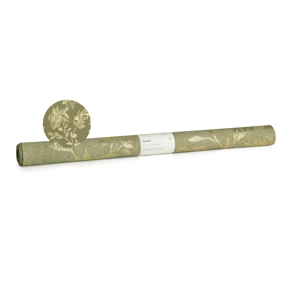 Deze stijlvolle groenkleurige stoffen banner is bedrukt met een gouden bloemmotief. De banner is voorzien van 2 ophangtunnels. Deze mooie banner is te gebruiken in je etalage of winkel en brengt gelijk een sfeervol beeld. Met zijn formaat van 220x70cm super te gebruiken als achtergrond van je presentatie.