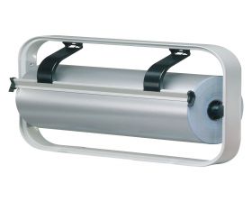 Neutraal grijs gelakt model met kartelmes, geschikt voor het afscheuren van folie en gelamineerd en/of metallic papier. Wand- en voetensteunen om de rolhouder op de toonbank of aan de muur te bevestigen apart verkrijgbaar.