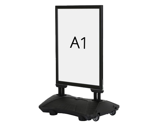 Dit handzame stoepbord Boulevard heeft een A1 afmeting van 59x84cm. Het stoepbord is een rollerbase, dus verrijdbaar door de wielen en op veren. De kleur is zwart. Voorzien van 4 klikprofielen en transparante voorzetfolie aan elk van de 2 zijden. De rugplaat is van metaal.